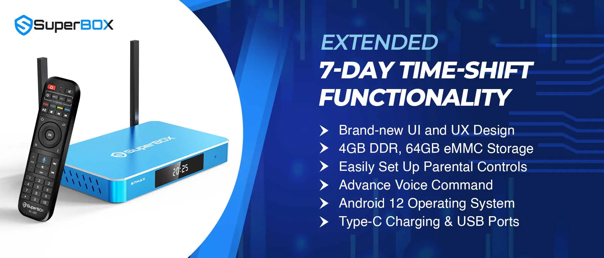 Never miss a moment with the SuperBox S7 Max. Its 7-day Time-shift feature lets you watch content from the past week on supported apps with one click. Catch sports, news, or series you missed in Chicago or Calgary. With 64GB storage, store more recordings. Perfect for busy homes in Miami or travelers in Dubai, this feature makes SuperBox S7 Max streaming flexible and easy.